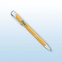 Penna con fusto in legno di bambù. Meccanismo a pulsante, con clip fustellata..